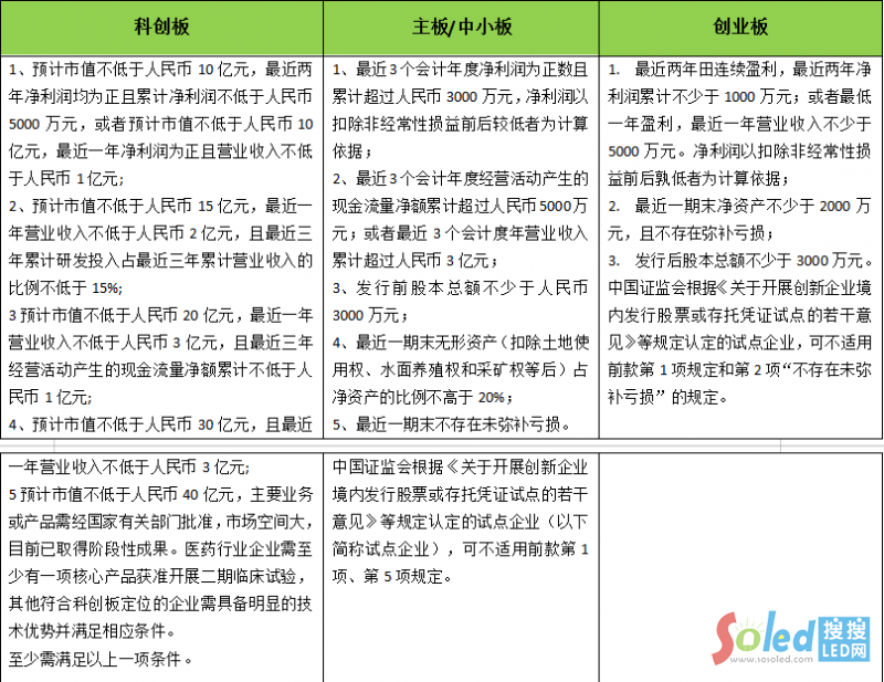 當前LED顯示屏企業(yè)對資金的渴求十分迫切,而上市是絕大多數(shù)企業(yè)夢寐以求的融資渠道。在現(xiàn)有幾大上市板塊中,新三板上市門檻最低,但由于融資效果不理想,一些上市后又不乏主動退市,所以LED顯示屏企業(yè)大多將創(chuàng)業(yè)板作為上市目標。畢竟,相對于科創(chuàng)板、主板與中小板,創(chuàng)業(yè)板的上市門檻相對要低一些。