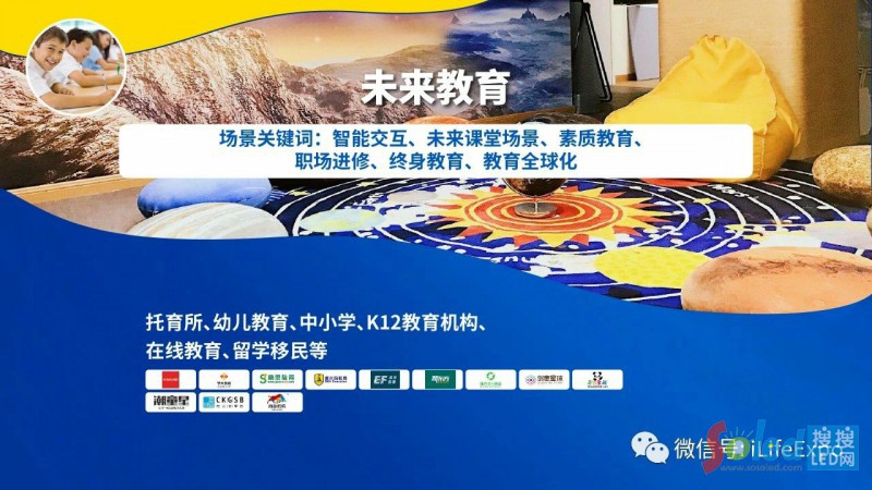 iLife2020未來教育展區(qū)主要展示包括托育所、幼兒教育、中小學、K12教育機構(gòu)、在線教育、留學移民等在內(nèi)的未來教育場景。場景關(guān)鍵詞:智能交互、未來課堂場景、素質(zhì)教育、職場進修、終身教育、教育全球化。