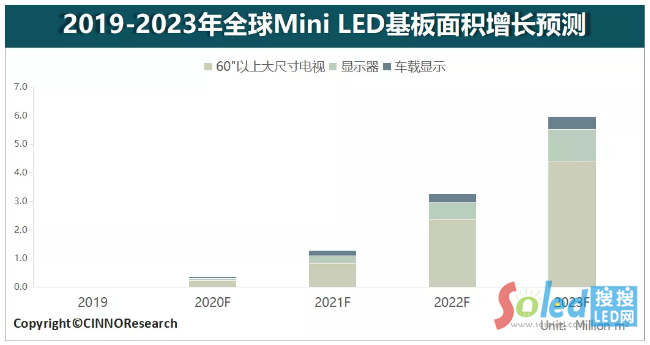 與移動產(chǎn)品過去常用的側(cè)入式背光不同,Mini LED背光由于LED體積小,光程需求短,因此即使在厚度要求較高的移動設(shè)備上仍可以采用直下式設(shè)計,在大尺寸和車載顯示上也可以起到明顯減少厚度的作用。通過高密度矩陣式排列,可以更好實現(xiàn)較為精細(xì)的區(qū)域調(diào)光,并且功耗表現(xiàn)較傳統(tǒng)背光更好。根據(jù)CINNO Research預(yù)測,到2023年,快速增長的Mini LED背光出貨量將在大尺寸電視、顯示器、車載等方面帶來至少約600萬㎡的相關(guān)基板需求。