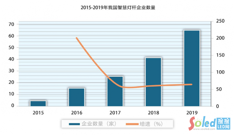 從目前落地的智慧燈桿示范性項(xiàng)目看,智慧燈桿外設(shè)種類繁多,而且都是模塊化安裝,廣泛應(yīng)用于交通、市政、園區(qū)、安防等場景,然而,當(dāng)前應(yīng)用普遍處于摸索階段。沖著它的巨大發(fā)展前景,瞄上智慧燈桿產(chǎn)業(yè)的各類企業(yè)多如牛毛,但真正有實(shí)際產(chǎn)品、能實(shí)落地實(shí)施的智慧燈桿企業(yè)其實(shí)并不多,中國照明行業(yè)協(xié)會(huì)的數(shù)據(jù)顯示,2015年只有5 家,截止去年(2019年)上升到65家。