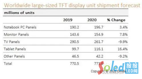 Omdia上周也指出,大尺寸面板市場(chǎng)開始復(fù)蘇。預(yù)計(jì)2020年全球大尺寸面板出貨量將達(dá)7.716億片,比2019年的7.705億片增長(zhǎng)不到1%,這個(gè)數(shù)據(jù)包括9英寸及以上的LCD(液晶)和OLED面板。本年度的增長(zhǎng)總量持平,上半年面板市場(chǎng)及全球經(jīng)濟(jì)劇烈變化,下半年相比可能會(huì)有很大不同。