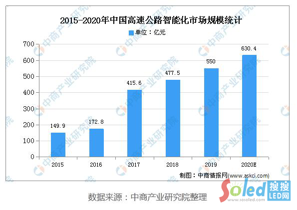 隨著人工智能技術(shù)的逐步成熟以及多項政策的推動下,高速公路智能化、智慧化成為當(dāng)下公路運輸?shù)闹饕l(fā)展方向,通過基礎(chǔ)設(shè)施的建設(shè),公路網(wǎng)絡(luò)建設(shè)將持續(xù)增加,公路貨運能力也將不斷提升。數(shù)據(jù)顯示,2015-2017年中國高速公路智能化市場規(guī)?焖侔l(fā)展,從149.9億元增長至415.6億元,3年間增長了265.7億元,年均復(fù)合增長率達到40%。隨著中國高速公路智能化建設(shè)的進一步發(fā)展,市場規(guī)模將逐漸攀升,中商產(chǎn)業(yè)研究院預(yù)測,2020年我國高速公路智能化市場規(guī)模將突破600億元大關(guān)。