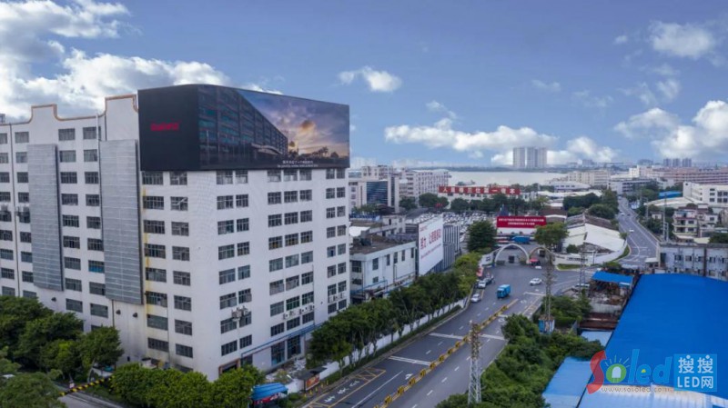 2020年9月,在格蘭仕順德總部,一棟大樓外圍頂部完成了最新的樓面設(shè)計,L型曲面巨型LED顯示屏全面點亮,奪目鮮艷的顯示畫面,為沉寂的工業(yè)區(qū)喚醒了新的生命力。