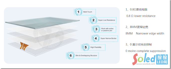 metal Mesh 32寸至86寸大尺寸觸控模組、折疊手機電容屏、86寸至120寸納米金屬大尺寸觸控模組、ITO1.54寸至55寸全尺寸觸控模組。