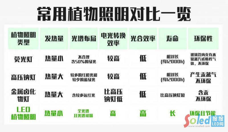那么,作為新型植物照明的代表——LED植物照明,與市場常見的熒光燈、高壓鈉燈、金屬鹵化物燈等植物照明產(chǎn)品有什么不同呢?它這么火到底優(yōu)勝在哪?