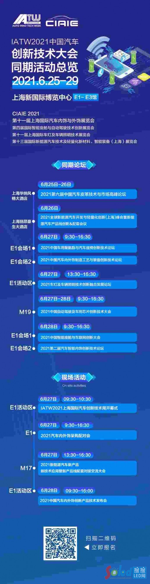 距離上海國(guó)際汽車(chē)創(chuàng)新技術(shù)周(IATW 2021)&第十一屆中國(guó)上海國(guó)際汽車(chē)內(nèi)飾與外飾展覽會(huì)(CIAIE 2021)越來(lái)越近,長(zhǎng)按下方圖片識(shí)別二維碼,抓緊時(shí)間預(yù)登記。