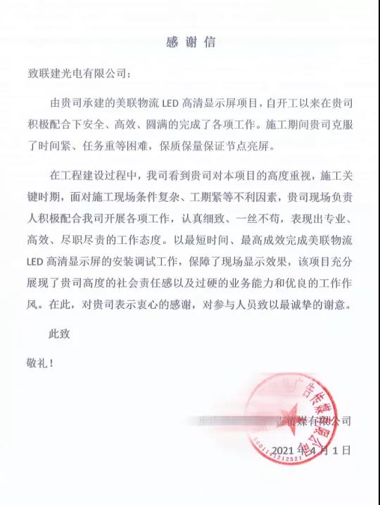 *聯(lián)建光電美聯(lián)廣場玉章故居項目感謝信
