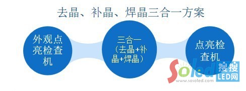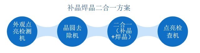 在直顯背光都適用的三合一自動檢修方案中,在經(jīng)過外觀、點(diǎn)亮檢測之后,PCB板進(jìn)入去晶、補(bǔ)晶、焊晶三合一全自動修補(bǔ)設(shè)備完成檢修。這方案可以大幅減少設(shè)備數(shù)量,并且可以將背光Mini Micro LED的檢修良率做到99.99%!