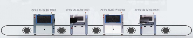 合易科技全自動智能Mini&Micro Led檢修線由在線外觀檢測機(jī)、在線點(diǎn)亮檢測機(jī)、在線晶圓去除機(jī)、在線激光焊晶機(jī)幾個核心設(shè)備組成。整合Mini&Micro Led檢測修補(bǔ)工藝各個環(huán)節(jié),全面提高檢修產(chǎn)線的自動化水平。具體流程為: