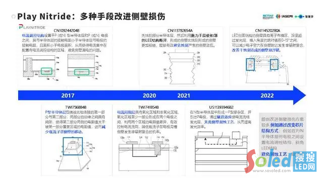 另外,在外延&芯片結(jié)構(gòu)技術(shù)領(lǐng)域中,Play Nitride是全球在該領(lǐng)域布局專利最多的創(chuàng)新主體。白皮書描繪了該公司利用多種技術(shù)手段改進(jìn)側(cè)壁損傷的技術(shù)路線,如通過改變芯片結(jié)構(gòu)方式,在P/N半導(dǎo)體層何電極之間設(shè)置電流調(diào)控結(jié)構(gòu)、斜角LED結(jié)構(gòu);或通過避免刻蝕工藝的方式,基于隧道效應(yīng)提升發(fā)光效率等。