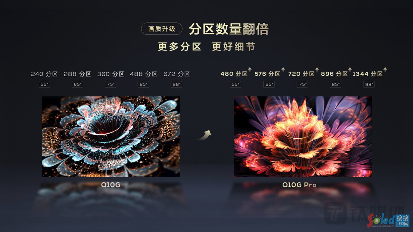 而TCL Q10G Pro則基于Q10G升級而來,畫質(zhì)升級方面,通過全新一代Mini LED背光技術(shù),TCL Q10G Pro實現(xiàn)分區(qū)數(shù)量成倍提升,98/85/75/65/55吋的分區(qū)數(shù)分別為1344/896/720/576/480,均超過三百級,控光精細程度提升100%,可減少光暈,并且可精確調(diào)節(jié)亮度。