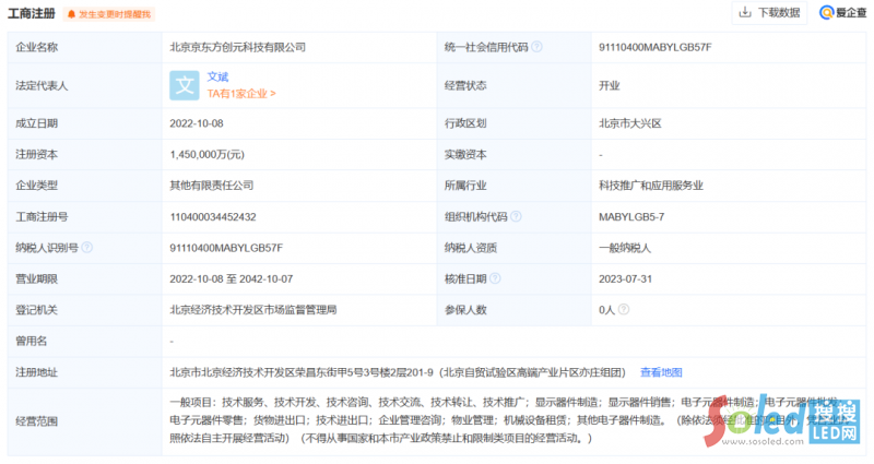 天眼查App顯示,近日,京東方旗下北京京東方創(chuàng)元科技有限公司發(fā)生工商變更,注冊資本由1000萬人民幣增至145億人民幣,增幅達(dá)1449倍。