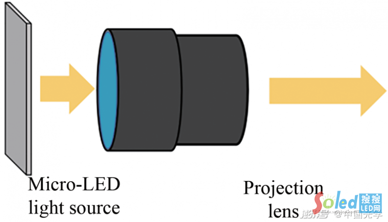 單片式μLED微投影系統(tǒng)僅由單片μLED顯示芯片和微投影鏡頭組成,μLED光源發(fā)出光束,經(jīng)微投影鏡頭投射到屏幕或者系統(tǒng)下一接收面(如AR的組合器)。