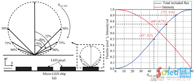 圖6: (a)平面內(nèi)μLED芯片單個(gè)像素發(fā)光示意圖;(b)單個(gè)像素光強(qiáng)和光通量隨角度分布的關(guān)系