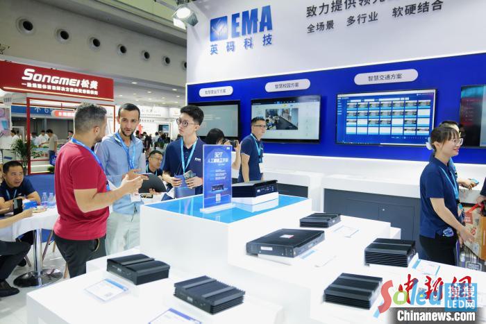 圖為外國客商關注廣州英碼科技研制的高性能智能工作站邊緣計算盒子。陳文 攝