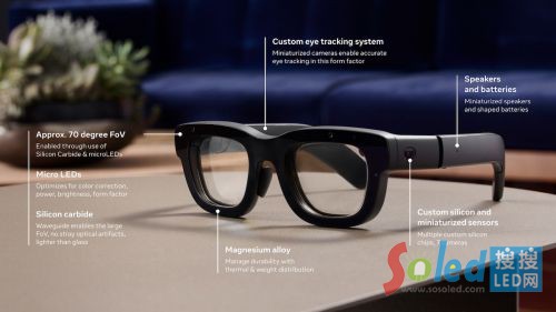 為將AI信息清晰的可視化,在顯示部分,Orion采用了碳化硅代替玻璃制作鏡片,其可以消除光學(xué)偽影或雜散光問題,并具有較高的折射率,另外Orion還搭載了Micro LED+光波導(dǎo)的顯示光學(xué)方案,使其視場角達(dá)到了70°。