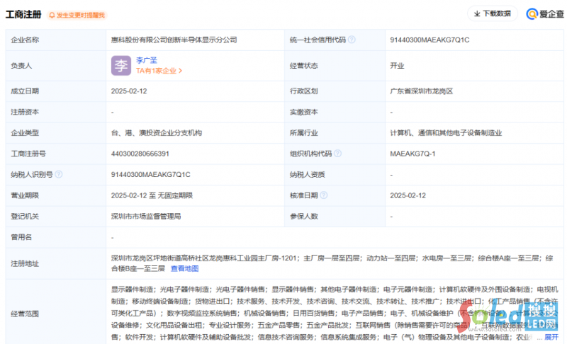 天眼查信息顯示,惠科股份現(xiàn)已在此處成立新公司,名為惠科股份有限公司創(chuàng)新半導(dǎo)體顯示分公司。進(jìn)一步的信息查詢顯示,“惠科股份有限公司創(chuàng)新半導(dǎo)體顯示分公司”成立于今年 2 月 12 日,注冊地址為深圳市-龍崗區(qū)-坪地街道-高橋社區(qū)-龍崗惠科工業(yè)園,而高橋社區(qū)的社區(qū)黨群服務(wù)中心就在柔性顯示基地的附近。