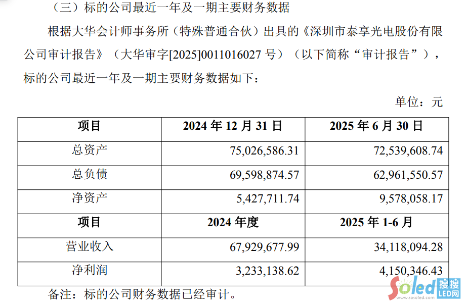 估值方面,評估機(jī)構(gòu)對泰亨光電全部資產(chǎn)及負(fù)債進(jìn)行了評估,截至評估基準(zhǔn)日2025年6月30日,在持續(xù)經(jīng)營條件下,泰亨光電申報的總資產(chǎn)賬面價值7,253.96萬元,總負(fù)債賬面價值6,296.16萬元,凈資產(chǎn)賬面價值957.81萬元。經(jīng)收益法評估,泰亨光電股東全部權(quán)益價值為2,787.00萬元,評估增值1,829.19萬元,增值率190.98%。