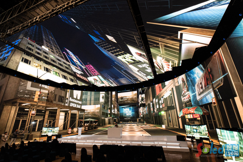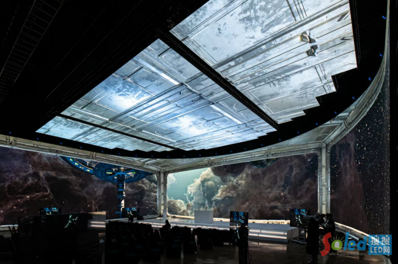 整個(gè)顯示系統(tǒng)由三部分組成:主背景屏幕是一塊寬60米、高8米的巨型結(jié)構(gòu),融合了36.5米的曲面段與23.5米的平面段,以覆蓋超寬視場角;頂部部署了一塊15米 × 21米的大型天幕LED屏,用于提供沉浸式環(huán)境光照;此外還配備了兩塊5 米 × 5 米的可移動屏幕,用于靈活補(bǔ)光或前景補(bǔ)充。