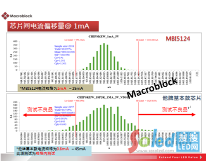 圖七、MBI5124芯片電流偏移量均落在1mA以內(nèi)(上圖),相對于競品宣稱應(yīng)用電流范圍0.6mA-45mA(下圖),但以1mA實(shí)測,卻有發(fā)現(xiàn)有相當(dāng)比例的不良品
