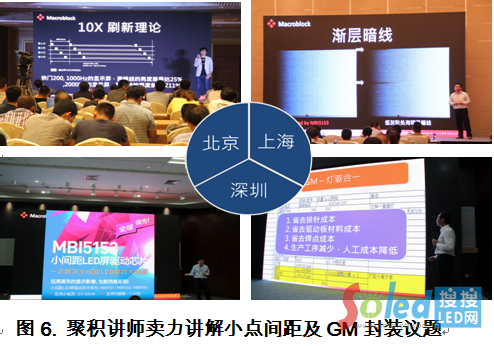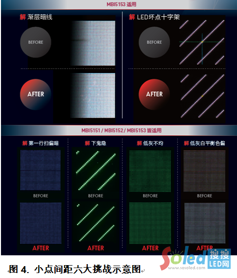 在上海站時(shí),聚信光電管道總監(jiān)謝忍龍?zhí)岬,目前顯示屏應(yīng)用最大的趨勢(shì)是點(diǎn)間距不斷縮小。租賃市場(chǎng)過(guò)去常用的P5,一路走到P2,表示顯示屏與觀眾的距離越來(lái)越近。在小點(diǎn)間距顯示屏的應(yīng)用,常見(jiàn)以下六大挑戰(zhàn),包括:漸層暗線、LED壞點(diǎn)十字架、第一行掃偏暗、下鬼影、低灰不均、以及低灰白平衡色偏。部分解決方案乃透過(guò)色彩校正的方式消除這些問(wèn)題,但事實(shí)上,色彩校正存在局限性,除了造成色域空間損失外,低灰細(xì)節(jié)亦流失。針對(duì)小點(diǎn)間距屏的六大挑戰(zhàn)(圖4),聚積提出小點(diǎn)間距專用芯片,具SRAM及Precision Driver II(提升電流精準(zhǔn)度:IC內(nèi)部通道±2.5%(最大值);IC間±3%(最大值)) 的驅(qū)動(dòng)芯片(如:MBI5153),在搭配好的控制器以及色彩校正,成功突破小點(diǎn)間距應(yīng)用六大挑戰(zhàn)。
