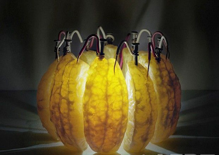 圖片中看到的水果電池實(shí)際上是LED燈組成的回路。一個(gè)3.5瓦的LED燈正常工作有時(shí)需要10個(gè)蘋果,有時(shí)候則需要20個(gè)。每個(gè)水果都有自己的電量。哈密瓜電量很強(qiáng),葡萄電量極少。他曾將200個(gè)葡萄連接在一起,卻只得到約1.5伏的電壓。