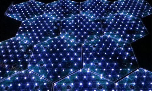 Solar Roadways 開發(fā)出了一個六角形的太陽能發(fā)電模組,可以依照當(dāng)?shù)氐耐恋卦煨徒M合起來,而且這個模組經(jīng)過了冰雪及耐壓的測試,讓它可以鋪裝在一般家庭的庭院里頭,像目前 Solar Roadways 所進行的測試階段,已經(jīng)把它鋪成露天車庫的地板。
