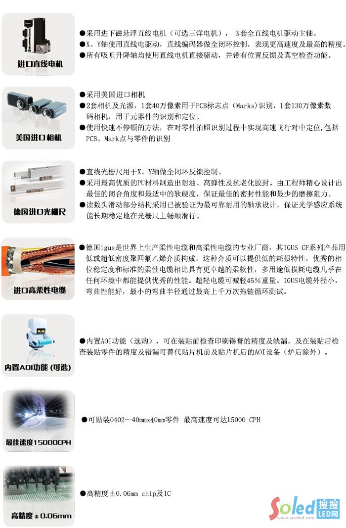 ● 滿足國內電子廠、SMT加工廠、LED應用廠商,LED燈具廠商貼裝LED3528,5050,3014 , 0402,0603、0805、1206、1210,1W大功率,3W大功率,IC等器件、封裝器件二級管、三極管等,有效的提高了貼裝的精度和效率,節(jié)省大量人工成本。